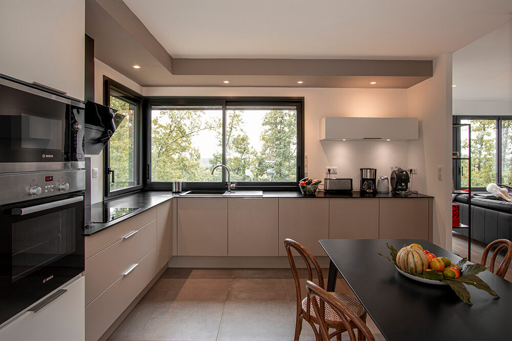Jacques a mis ses compétences au service de la conception de cette maison d’architecte. Sa construction a donc fait l’objet du plus grand respect de la nature et des exigences de la réglementation thermique en vigueur. L’équipement en brise-soleil des grandes baies améliore le confort d’été et le plancher chauffant diffuse une température douce et agréable l’hiver dans toutes les pièces.